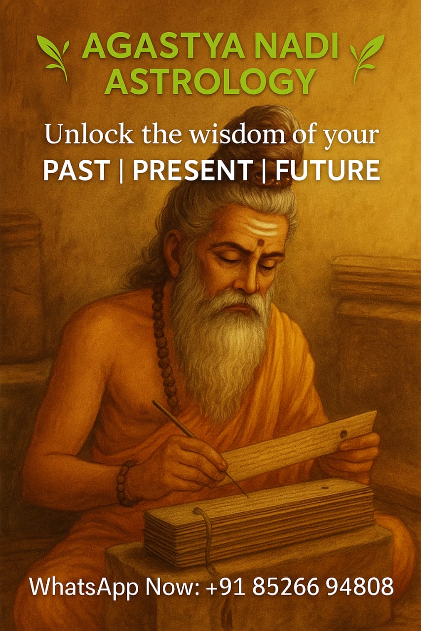 Agastya Nadi Jyotish is an ancient system of astrology that relies on palm leaf manuscripts containing detailed insights about individuals. These sacred texts, inscribed by enlightened sages thousands of years ago, are believed to hold the life records of those destined to seek them Unlike traditional astrology, which is based on birth charts, Agastya Nadi Jyotish identifies a person's corresponding palm leaf through their thumb impression. This practice has been followed for generations and continues to serve as a valuable source of guidance for those seeking clarity about their life's path..